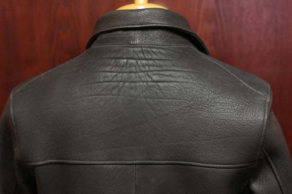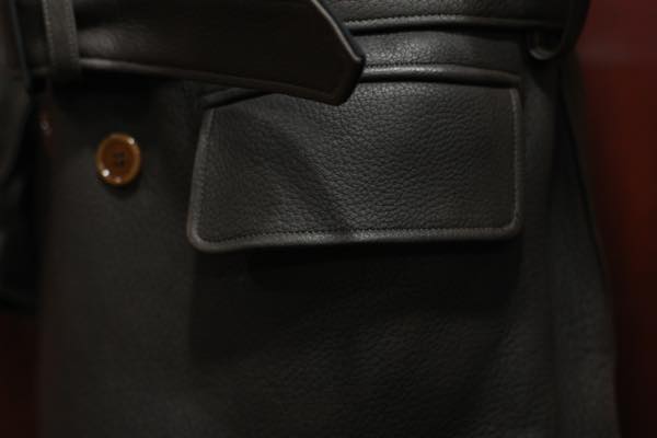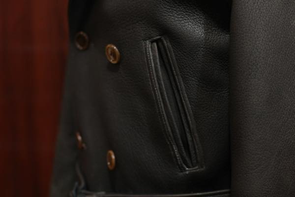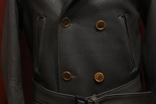 このジャケットのベースには、1930年代のレザーコート(カーコート)をモチーフにしており、フロントボタン仕様でフロントポケットが4個付いたディテールになっております。