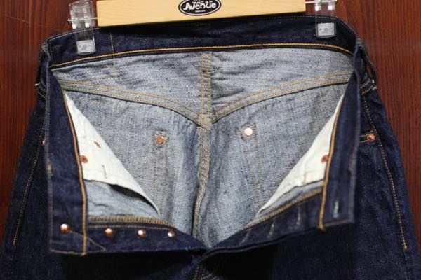 バックポケット裏側部分の隠しリベットは、平らな形状のリベットが打ちこまれておりますが、この年式からのリベットの殆どが、このタイプのモノになります。