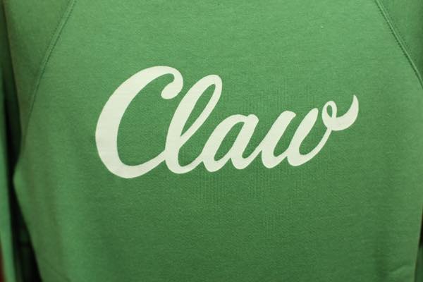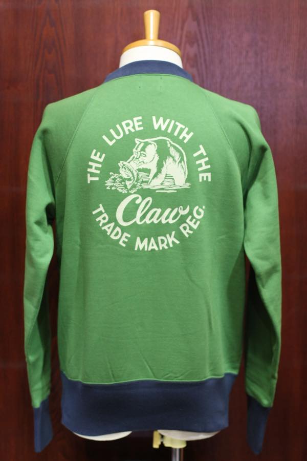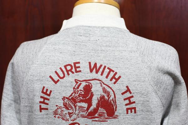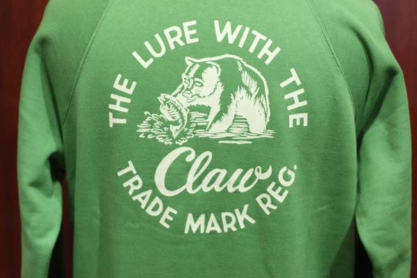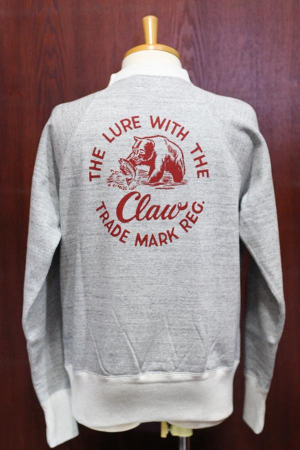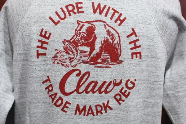 こちらのプリントは、1950年代を背景に架空のストーリーではありますが、釣具のメーカーのプロモーションとして制作されたスウェットシャツをイメージしております。フロントにはクロー(爪)、バックには熊が魚を捕まえてる姿がプリントされておりますが、熊の爪とルアーをイメージしたプリント内容になっております。