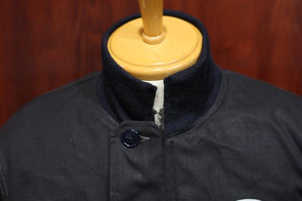 このデッキジャケットの特徴でもある、衿部分はスタンドカラーのウール・リブ仕様で、裾はN-1デッキジャケットの形状となっております。フロントポケットは底部分が円状になった絶妙な形のパッチポケットが取り付けられております。