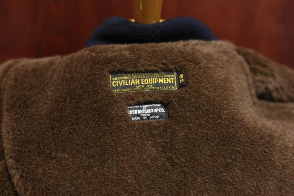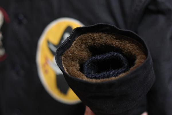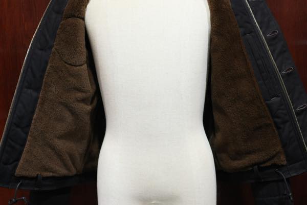 ライニングには、赤茶に染められたアルパカパイル100%生地を使用しており、寒さには欠かせない暖かいライニングとなっております。また、N1デッキジャケット同様に表のコットンダック生地とライニングとの間には、ヘビーフランネル生地が挟まれており、3重構造の丈夫で温かい作りになっております。