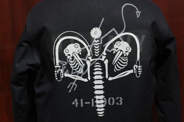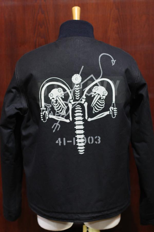 バックには、もともと海軍のデッキジャケットをベースにカスタムが施されておりますので、自主制作ということもあり “U.S. NAVY” のリフレクター・プリントを消すために黒の染み込みプリントで文字を塗りつぶしてあります。