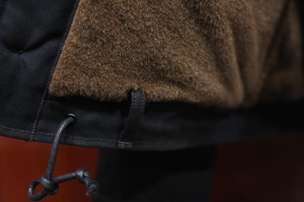 フロント前立て部分は、ジッパーとボタン留めになっており、袖口はインナーリブ(ウール素材)仕様でカフス裏までアルパカウールがライニングされており、デッキジャケットらしく遮風性を考慮した作りになっております。