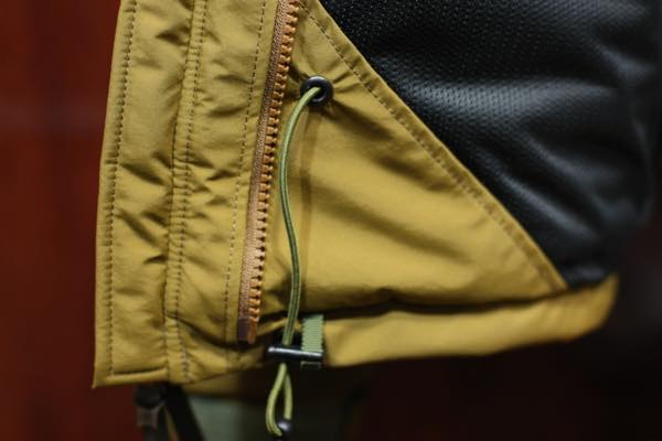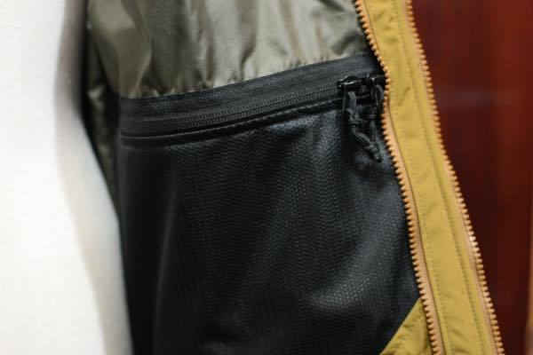 また、裏地には、ナイロンメッシュ素材が使用されたジッパーポケットも両身頃に付いており、もし雨に濡れても水捌けが良いです。