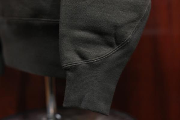ボディの素材は、質の高い特殊な綿を用いた強撚でムラが強く太い糸を敢えて使用し、加えて厚さや固さコシを出す為に編機の微妙なセッティングを幾度も繰り返し編み立てられた素材を使用しております。更に起毛は通常の2倍以上になるような工程を施しております。