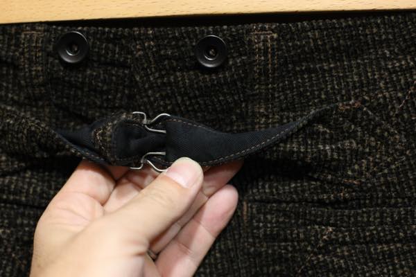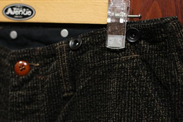 ベルト帯には、黒塗り鉄製のドーナツ型サスペンダーボタンが付き、お好みに応じてベルトでもサスペンダーでもお楽しみ頂けます。