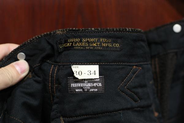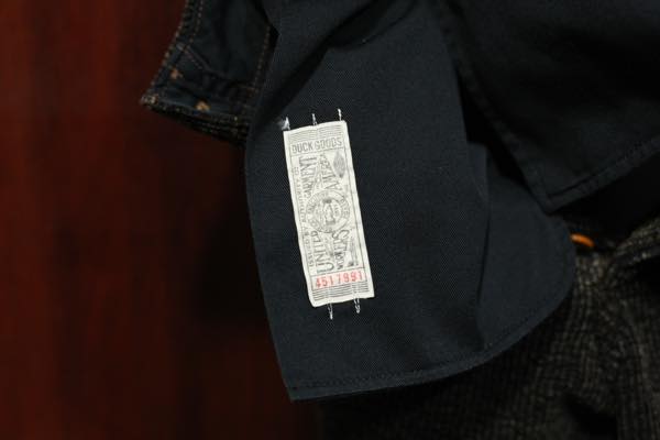 ウエスト周り裏側、フロントボタンホール比翼部分の内部と前立て裏、ポケットのスレーキにはコットン・ライト・モールスキン生地が使用されており、ポケットのスレーキには品質保証タグのユニオンチケットが縫い付けられております。
