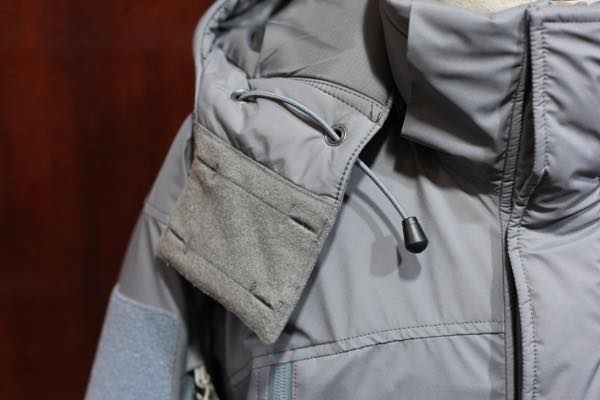 フード部分は、ジッパーで取外しが可能となっており、絞り調整ができるドローコードが3箇所付属しております。