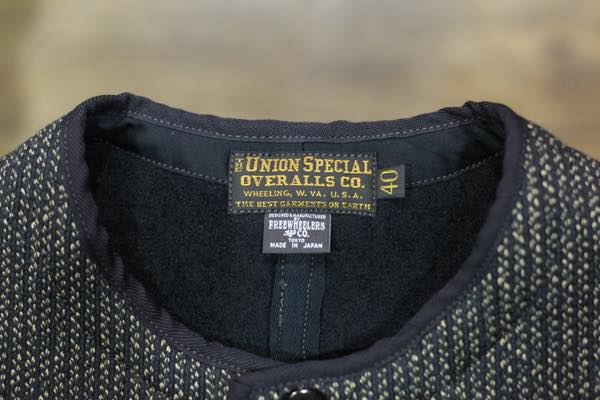 生地には、フリーホイーラーズオリジナルのビーチクロス(ウール70%コットン30%混紡素材)生地を使用しており、ハイゲージ(高密度)に織ったミディアム・ウェイト仕上がりになっております。以前リリースされているブリッジポートに使われていた生地をブラッシュアップされており、ストライプ感がより強めに出ております。