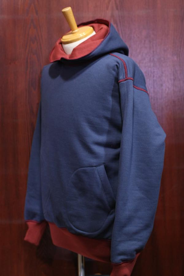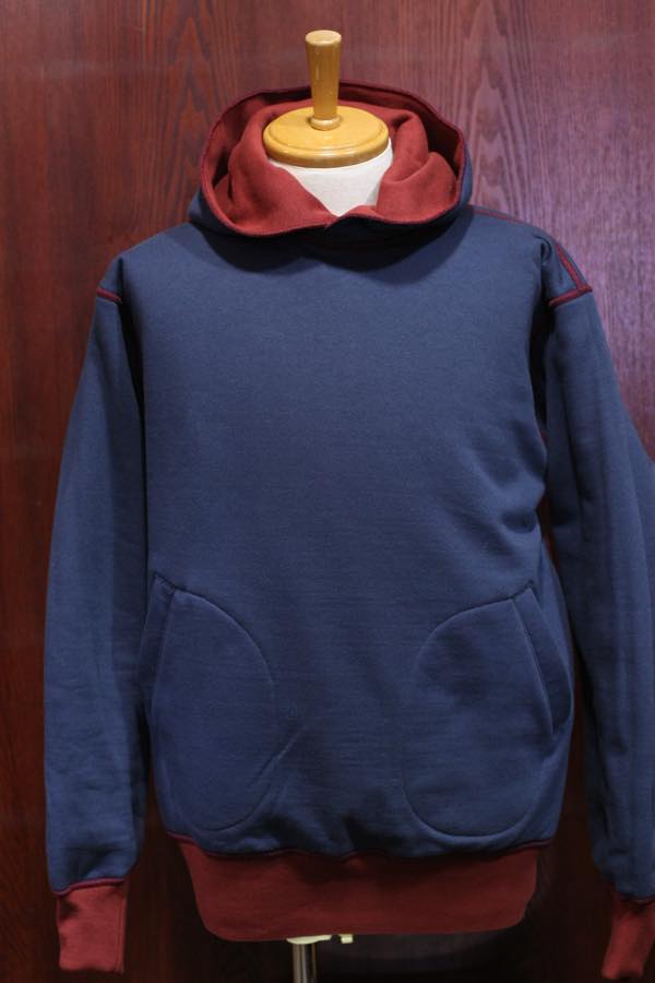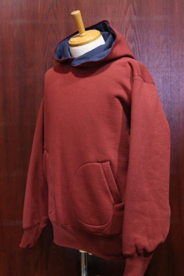 1920〜30年代のヴィンテージ・スウェット・パーカーをモチーフにしており、フード裏はミディアム・ウェイト生地を使用したダブルフェイス仕様でフードの周りにはロック・ステッチで施されております。またフード形状は頭頂部が尖った形状になっております。