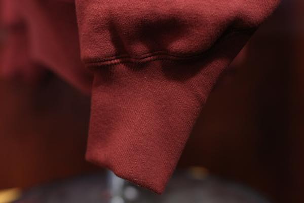 表のボディ素材は、質の高い特殊な綿を用いた強撚でムラが強く太い糸を敢えて使用し、加えて厚さや固さコシを出す為に編機の微妙なセッティングを幾度も繰り返し編み立てられた素材を使用しております。更に起毛は通常の2倍以上になるような工程を施しております。