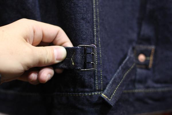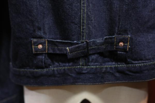 フロントポケットが外れ、フロントボタンが4つになっております。大戦モデルでよく見られるディテールではありますが、所謂大戦モデルの初期型とでも言いましょうか簡素化が始まりフロントボタンも5つから4つへ移行する段階で、ドーナツボタンではない鉄製のボタンが使用されております。