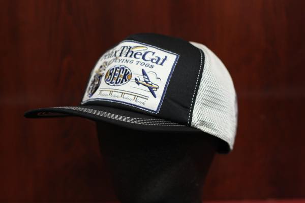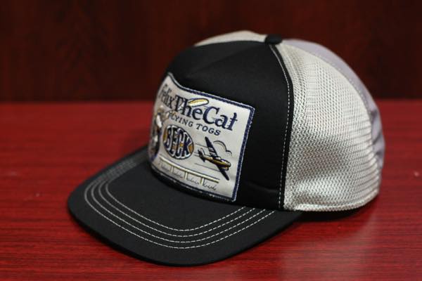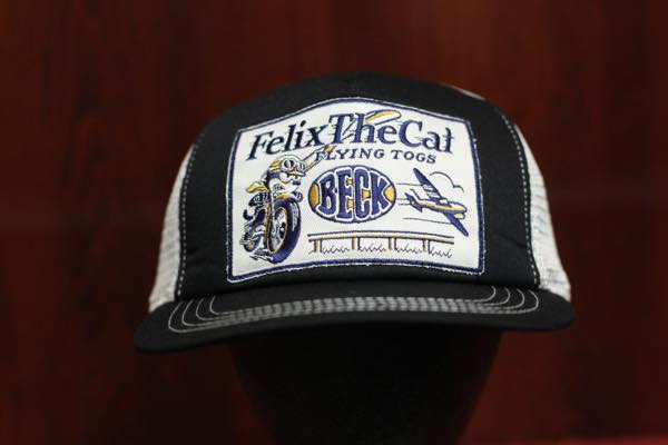 強風の中を颯爽とスピード上げて進む航空機やモーターサイクルをモチーフとした、総合アクセサリーカンパニー “BECK” のロゴ。ヴィンテージ界でよく知られている同ロゴのモーターサイクリストをフィリックス ザ キャットに置き換えて作成した刺繍製パッチをオリジナル・メッシュキャップのフロントに取付けてあります。