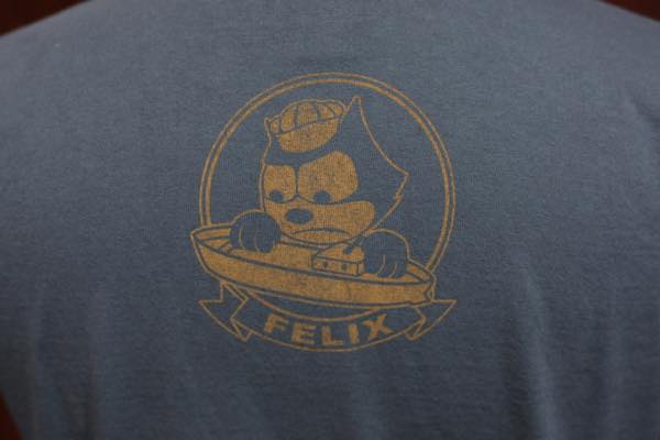 海の平和を守るために活躍したコンソリデーテッドPBY-5Aカタリナ飛行艇。同飛行艇のニックネームは “CAT” というわけでセーラーハットを被って海を譲る FELIX THE CATの描き下ろしイラストをTシャツにプリントした。