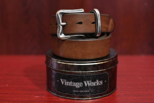 ヴィンテージワークスより、厚銀メッキ仕上げバックルを使用した、シングルピン タイプのレザーベルトになります。