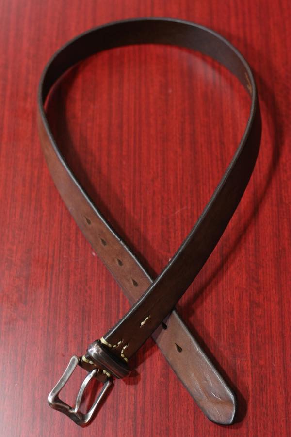 このベルトに使用しているレザーは、北米産ベンズレザーを使用しております。ベンズレザーは、牛革の中でも最高ランクの腰から尻の部位部分にあたる所で、シボ感ツヤ感などがよく現れる部分となっております。